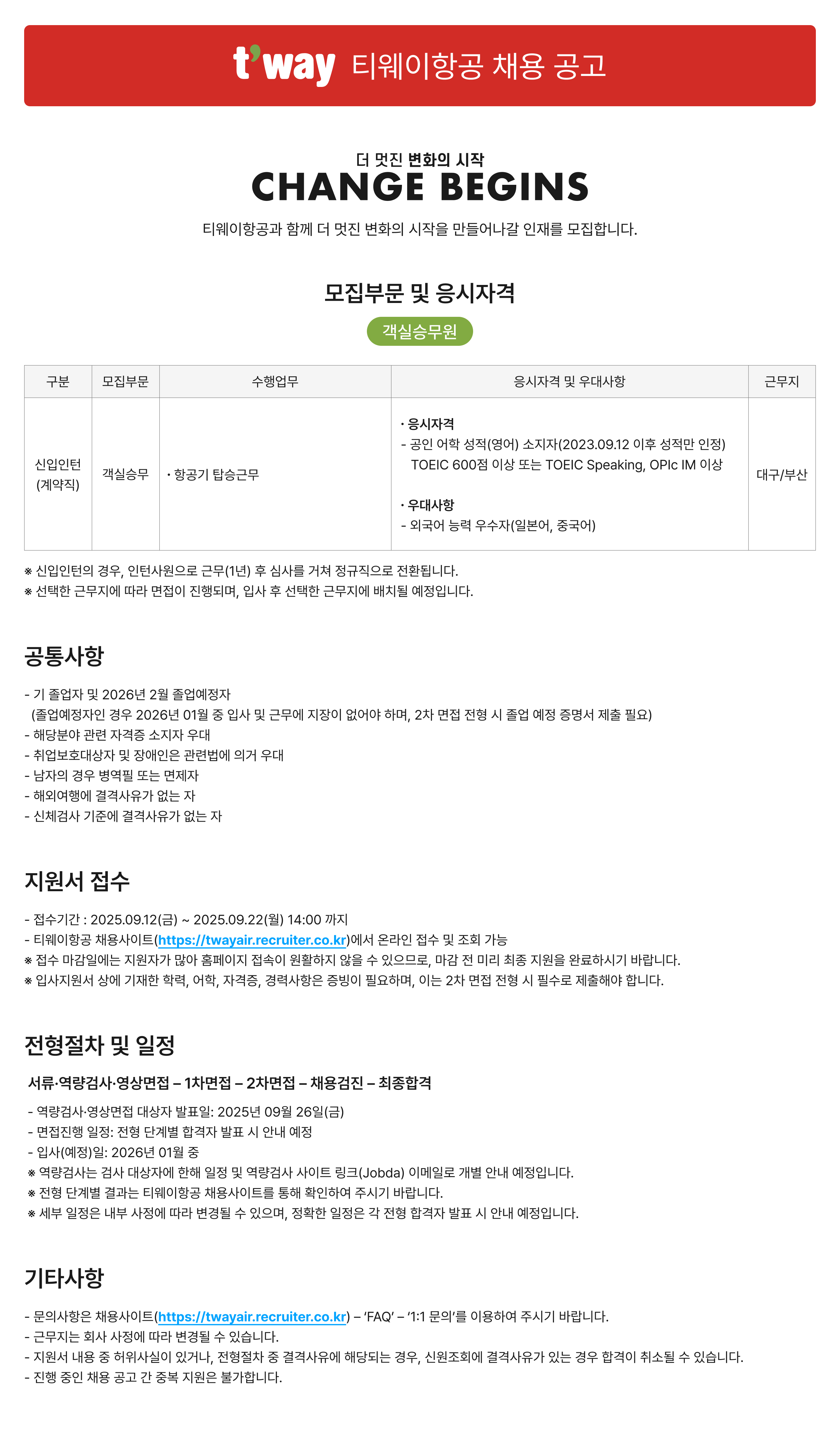 2025 티웨이항공 객실승무 채용공고 (대구/부산)
