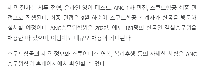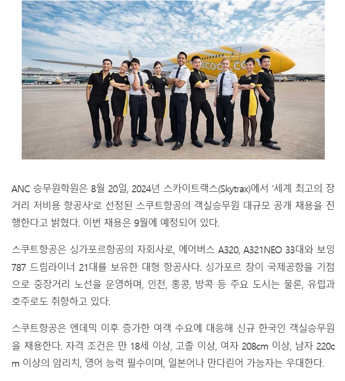 ANC 승무원학원, 9월 싱가포르 스쿠트항공 객실승무원 대규모 채용